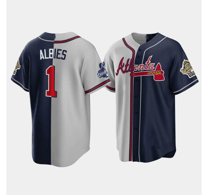 - Official Men's Braves 1995 Throwback Split Ozzie Albies Gray Navy 2021 World Series Champions Jersey